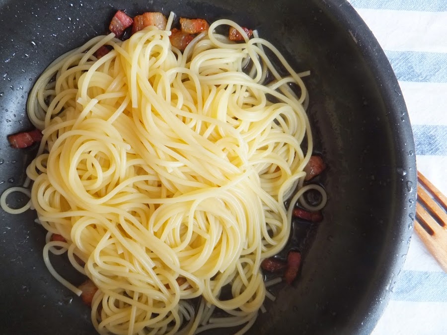 4. Cuando los espaguetti estén listos echalos sobre la sartén con la panceta. Mezcla bien y retira del fuego.
