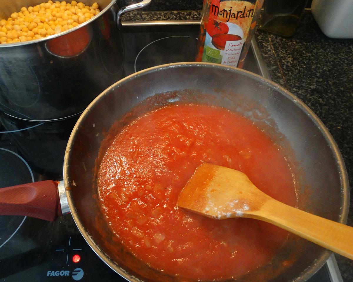 Ponemos el sofrito en el vaso de la batidora y le añadimos el caldo. Trituramos muy bien y vertemos sobre los garbanzos cocidos y escurridos que tendremos en la cazuela a fuego medio.