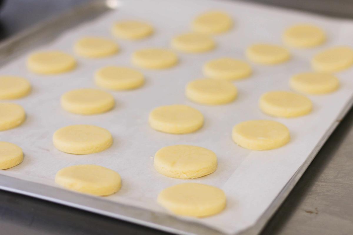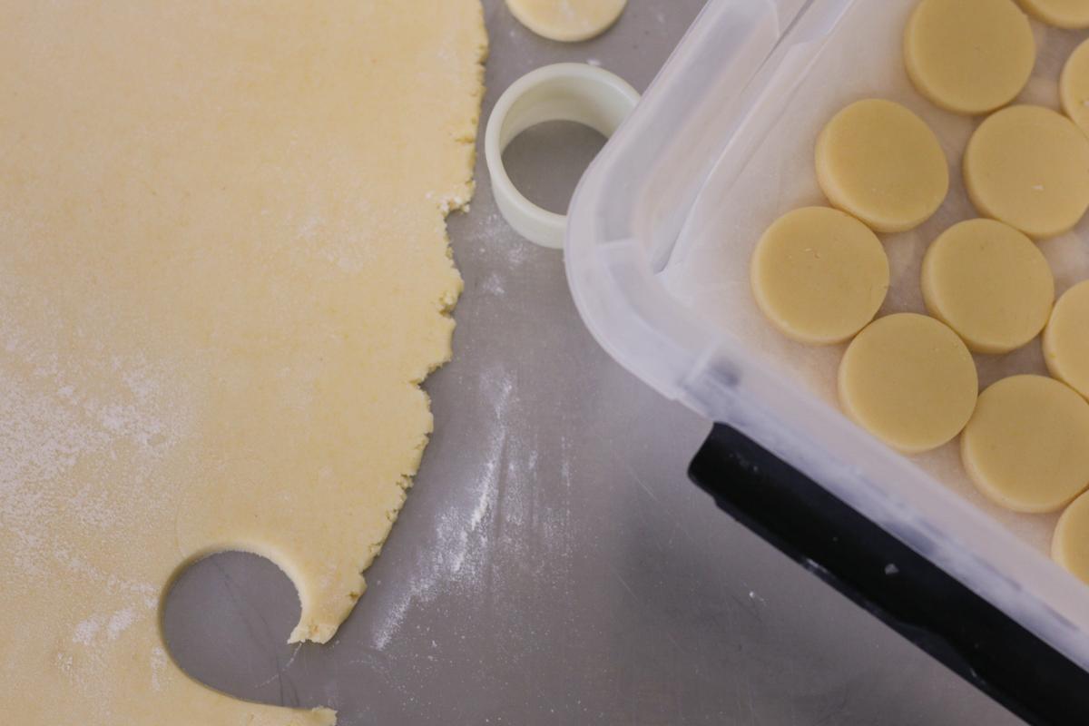 Cortar las tapitas con un cortante de 4 cm de diámetro (se expanden en el horno), y colocarlas sobre una placa con papel manteca. Si quieren, pueden congelar las tapitas crudas, separadas con papel manteca. Esto es muy práctico para cuando quieren vender y tienen que hacer producción.