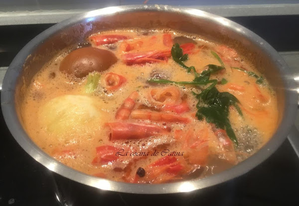 Con la cabeza, las espinas de la lubina y las cabezas y pieles de las gambas, unas verduras y un buen tallo de perejil he hecho un fumet que lo emplearé en lugar del caldo de pescado.