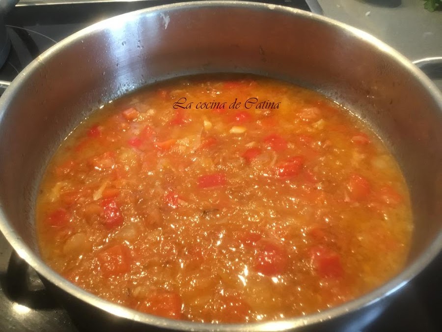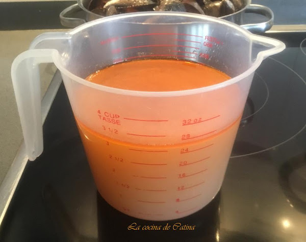 Cuando reanude a hervir, retiramos la cacerola del fuego, trituramos el contenido, lo pasamos por un colador tipo chino, y volvemos a poner la salsa al fuego, comprobando el punto de sal y el punto de espesor. Si está poco sabroso, sazonamos al gusto y si está muy espeso, añadimos un poco de agua.