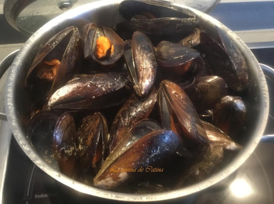 Pelamos las gambas, las sazonamos y las reservamos. Sazonamos también la carne de los mejillones cocidos y los reservamos.