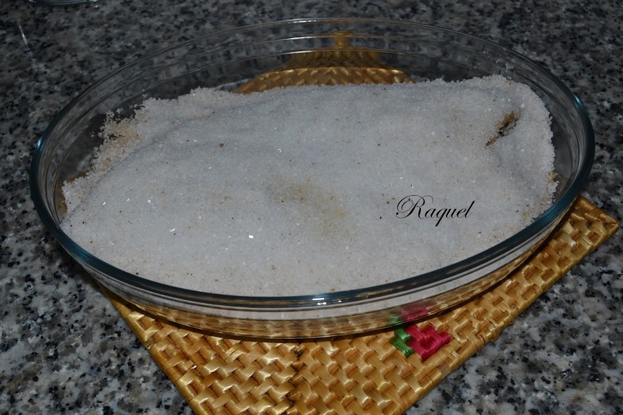 Sacar del horno y dejar reposar unos minutos, veréis que se ha formado una costra con la sal.
