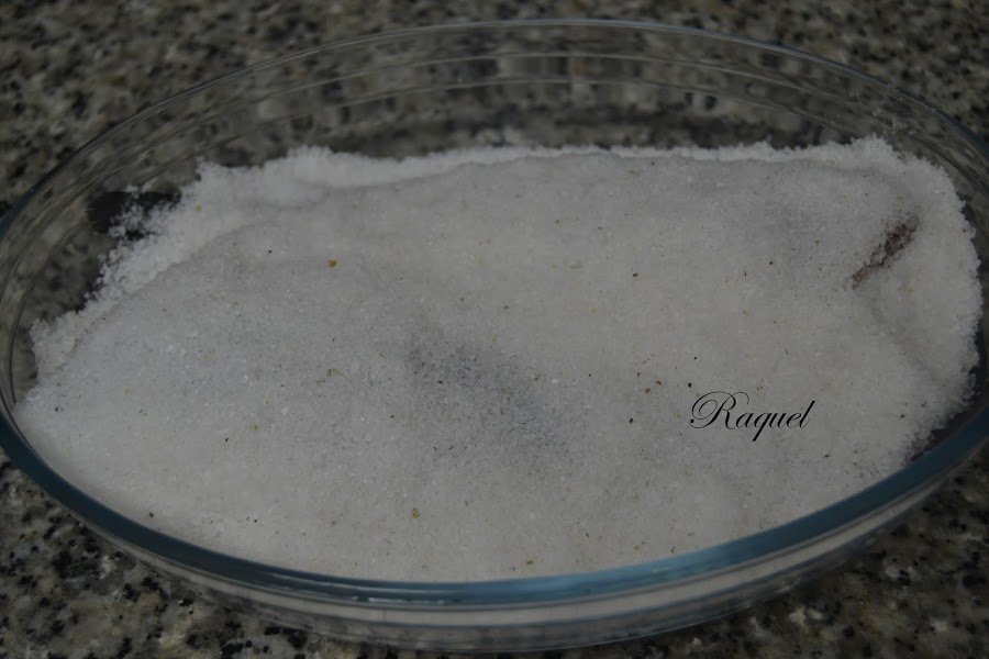 Ponemos en una bandeja para el horno una capa de la sal mezclada.