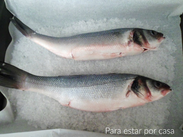 En la bandeja del horno extenderemos una capa uniforme de sal y por encima de ella colocaremos las lubinas.