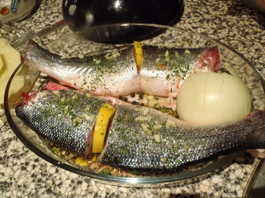 En una fuente apta para horno, se colocan las patatas, encima la lubina, la hacéis un par de rajas en mitad para colocarle un par de rodajas de limón y darle más gusto al plato. Ahora se le echa un buen chorro de aceite, el vino blanco y se sala. Mientras machacamos el ajo y el perejil en el mortero y se echan por encima. Pelamos la cebolla y sin partir la ponemos en la bandeja para que se queda el sabor en el pescado.