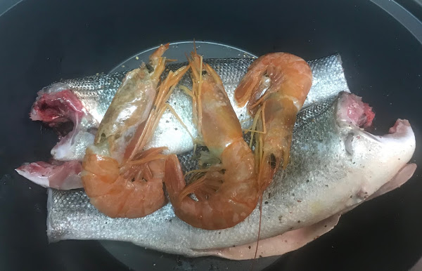 Ahora con mucho cuidado sirve las lubinas acompañadas de la salsa, yo tenía 3 gambas huerfanas y las añadí, y un poco de pisto como guarnición.