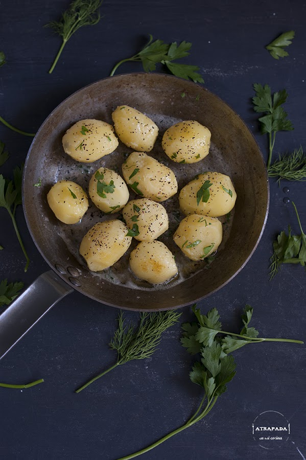 Salteamos en una sartén con un poco de mantequilla las patatas peladas hasta que estén calientes (yo he usado de nuevo la sartén de hierro mineral B. De Buyer que me está dando un resultado extraordinario en diferentes tipos de elaboraciones y que podéis adquirirla en Claudia&Julia a un precio estupendo). Una vez salteadas añadimos un poco de perejil y sal con hibiscus (podéis cambiar por flor de sal).