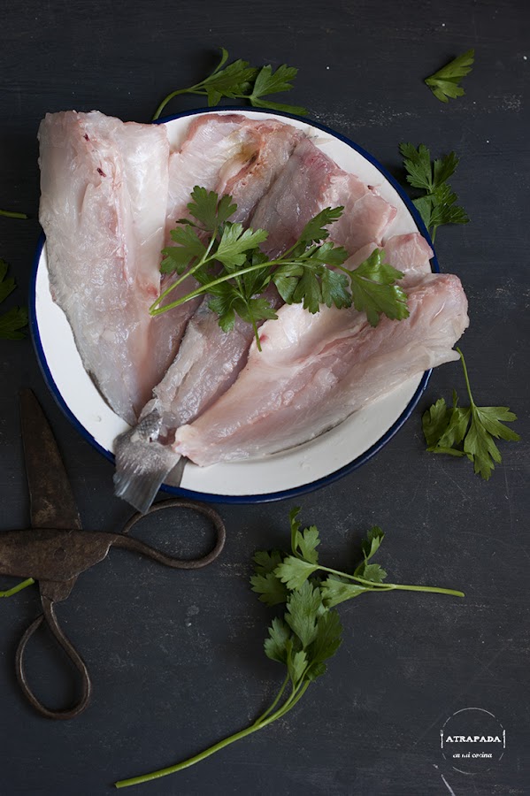 Primero tendremos que limpiar las lubinas y sacar los lomos. Si no os atrevéis podéis pedirlo al pescadero. En mi caso me las abrió pero no sacó los lomos, por lo que después lo hice yo (no con mucho esmero, todo sea dicho). Reservamos. Mientras, ponemos a calentar un cazo con agua y ponemos las patatas bien lavadas hasta que estén cocidas. Sacamos y dejamos enfriar para poder pelarlas con facilidad.