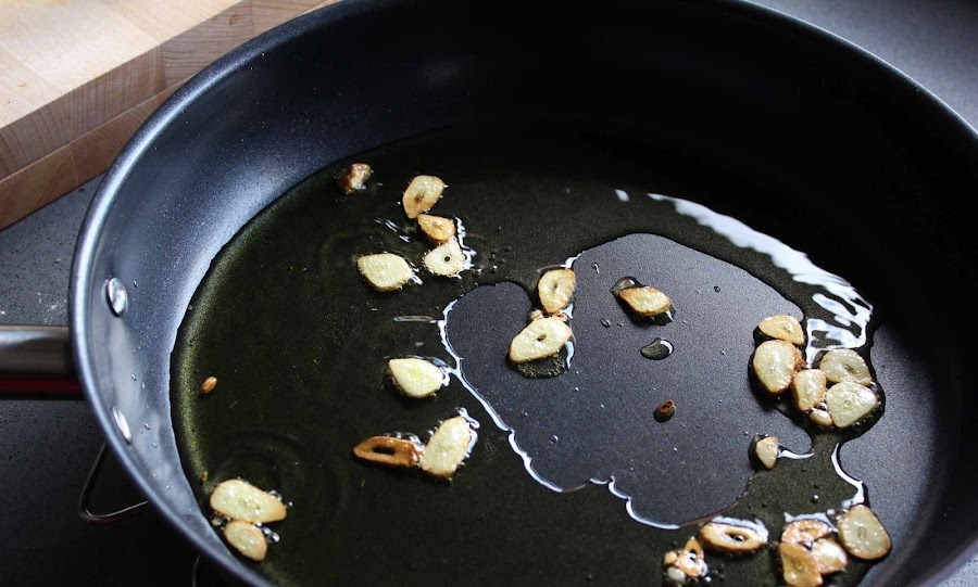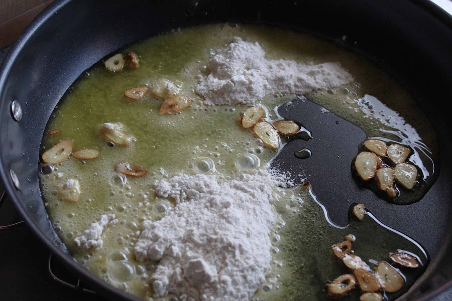En una sartén doramos los ajos laminados y añadimos la harina. Removemos, hasta tostarla.