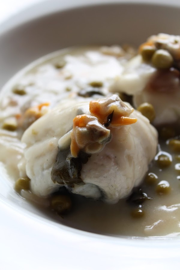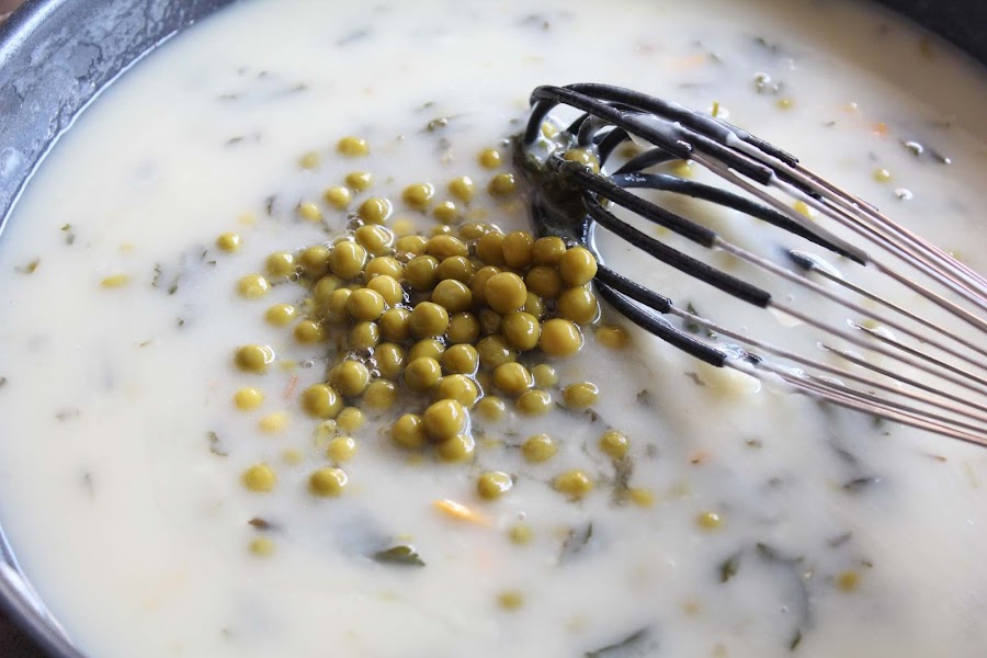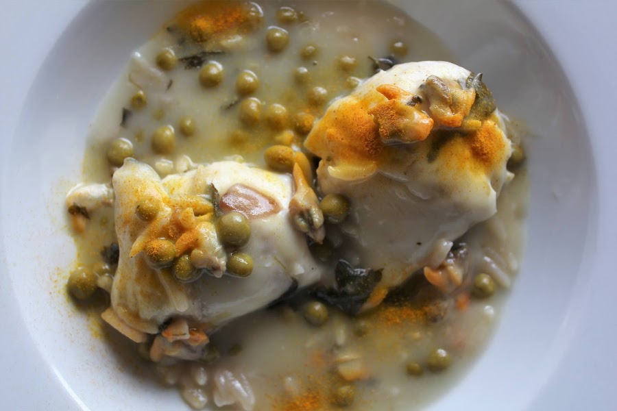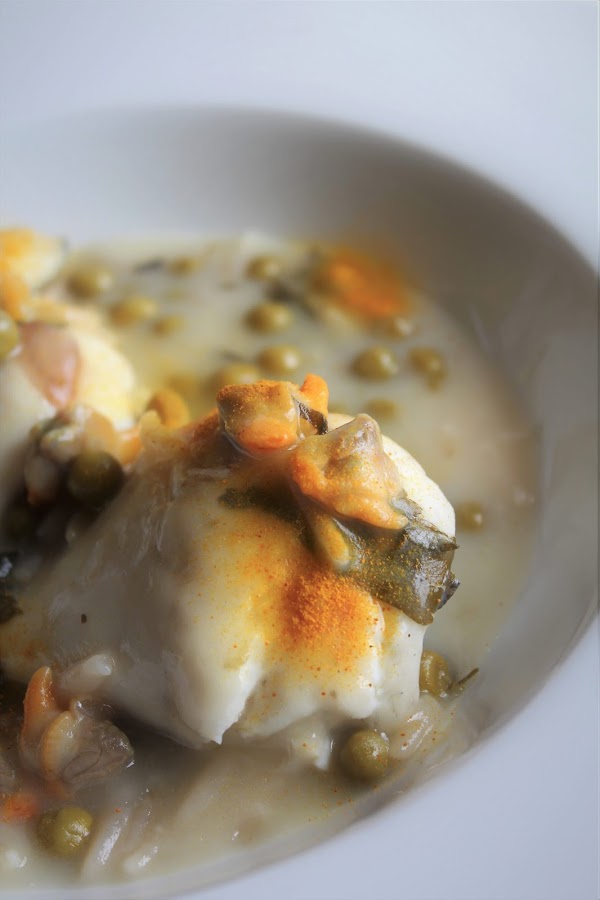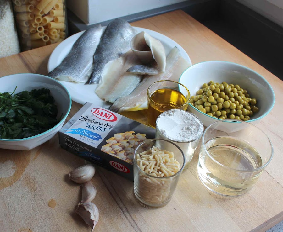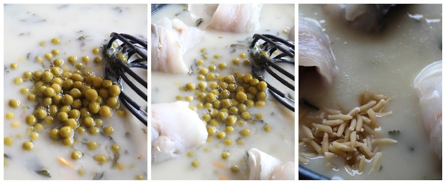 Añadimos los guisantes, su jugo y dejamos que empiece a hervir. Lomos de lubina y los gurullos.