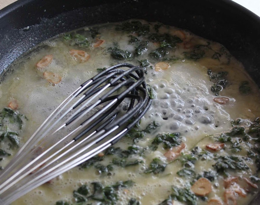 Incorporamos el perejil, el vino y un vaso de agua. Vamos haciendo una "bechamel" ligerita.