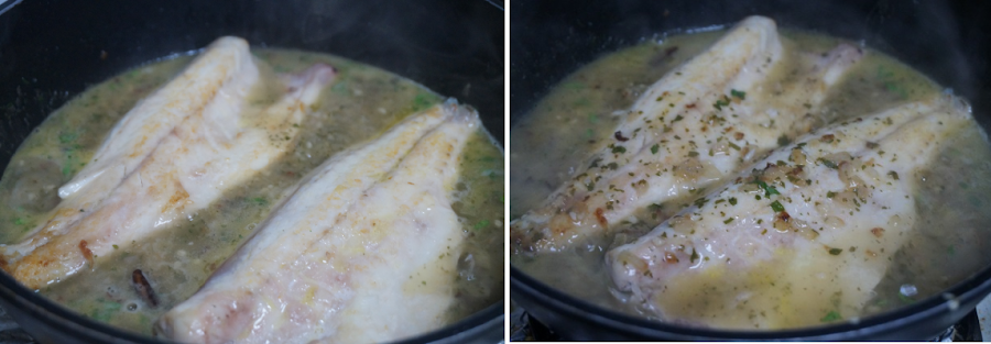 Añadimos las lubinas, dejamos cocinar 5 minutos, añadimos bastante perejil picado. Iremos moviendo la cazuela con movimientos de vaivén para que se vaya atando la salsa.