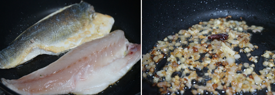 Ponemos una sartén al fuego con un poco de aceite, doramos los filetes de lubina a fuego fuerte y sacamos. Reservamos.