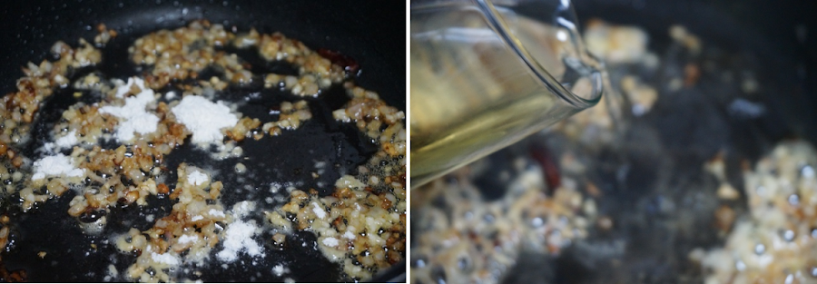 En esa misma sartén con un poco más de aceite añadimos la cebolla y la mitad de los ajos, dejamos dorar, podemos poner una cayena para que esté un puntito picante. Cuando esté dorada la cebolla añadimos la cuchara de harina, removemos dejamos se cocine y añadimos el vaso de vino blanco.
