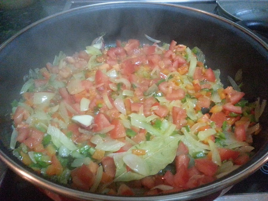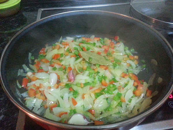 Picamos en juliana fina la cebolla, lavamos y cortamos los pimientos. En una sartén con uno poco de aceite, sofreímos la cebolla, los pimientos y los dientes de ajo sin pelar y la hoja de laurel.