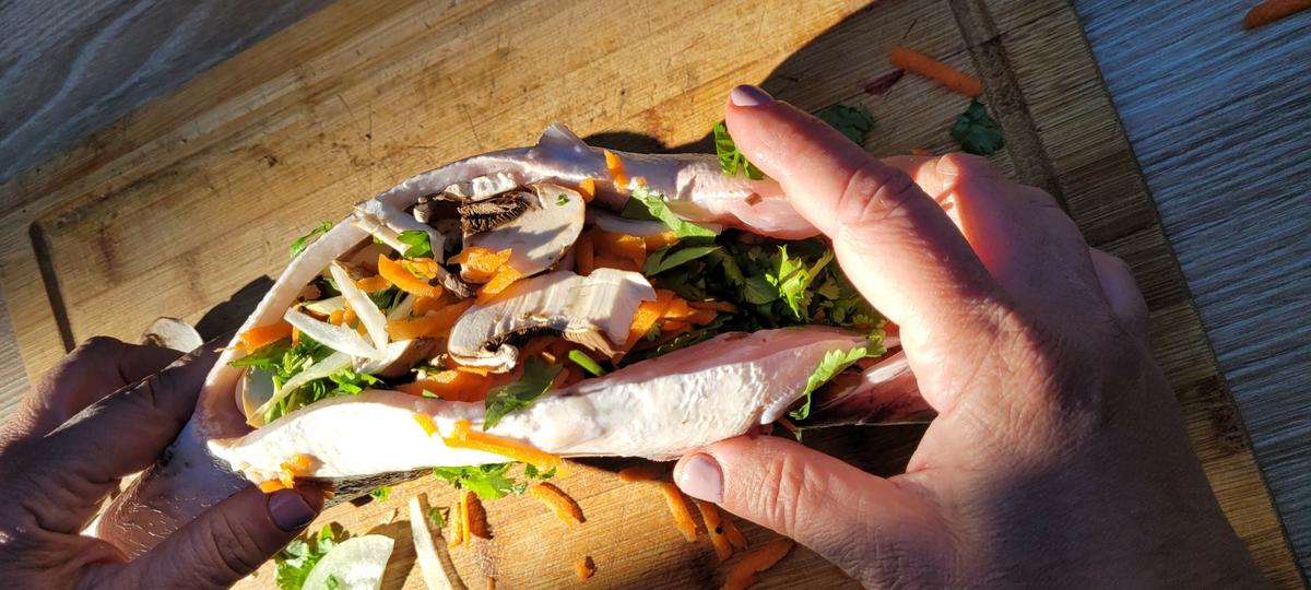 Rellena el pescado, con todas estas verduras, que ya debes tener ya listas, coloca el pescado sobre la cama de sal.