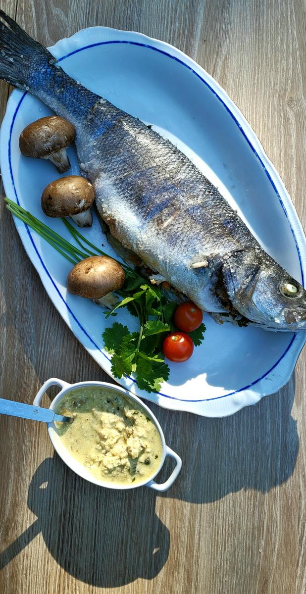 En un bol, mezcla todos los ingredientes y ya la tendrías. Prueba y rectifica la sal, si es necesarioUna lubina grande entre 1 kilo y un kilo y medio, da para 4 personas.