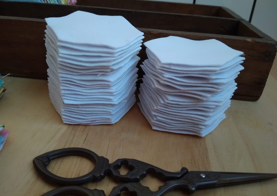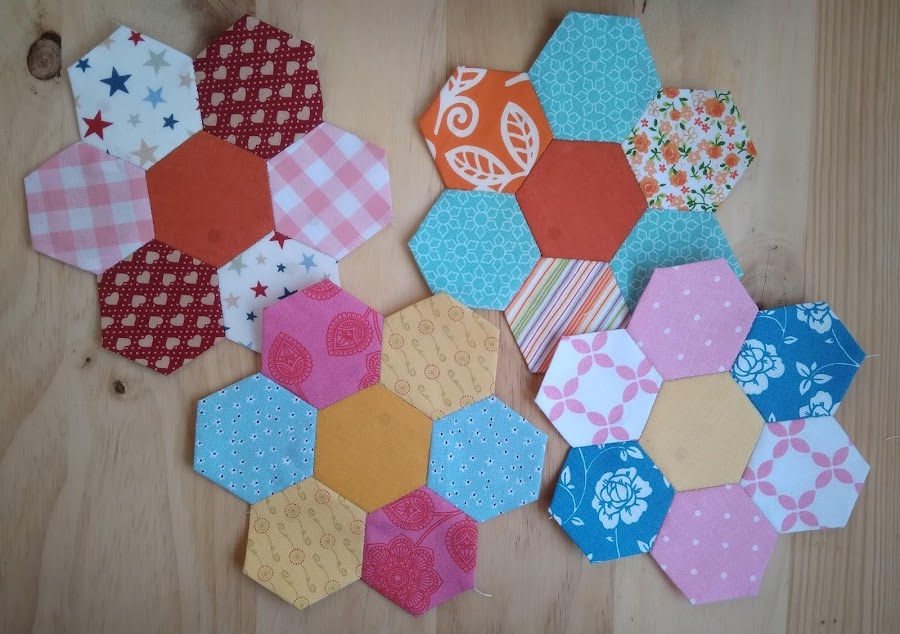 Algunos de los hexágonos de estas flores ya los tenía hechos, otros no. Y también he hecho más hexágonos estampados para seguir haciendo flores.