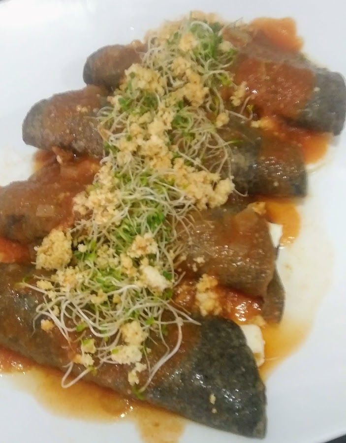 Es una receta clásica y muy fácil desde mi punto de vista. Ya me dirán qué les parece. Yo usé tortillas de maíz azul nixtamalizado que me encanta y les di mi toque con el germinado de alfalfa. Las rellené de distintas cosas: unas de queso panela, otras de huevo cocido que tenía del día anterior y unas más de quesito de almendras. Ustedes pueden rellenarlas de lo que quieran, frijoles, huevo, camote, aguacate, vegetales... les digo que imaginación es lo que sobrará. Y vamos pues, con los