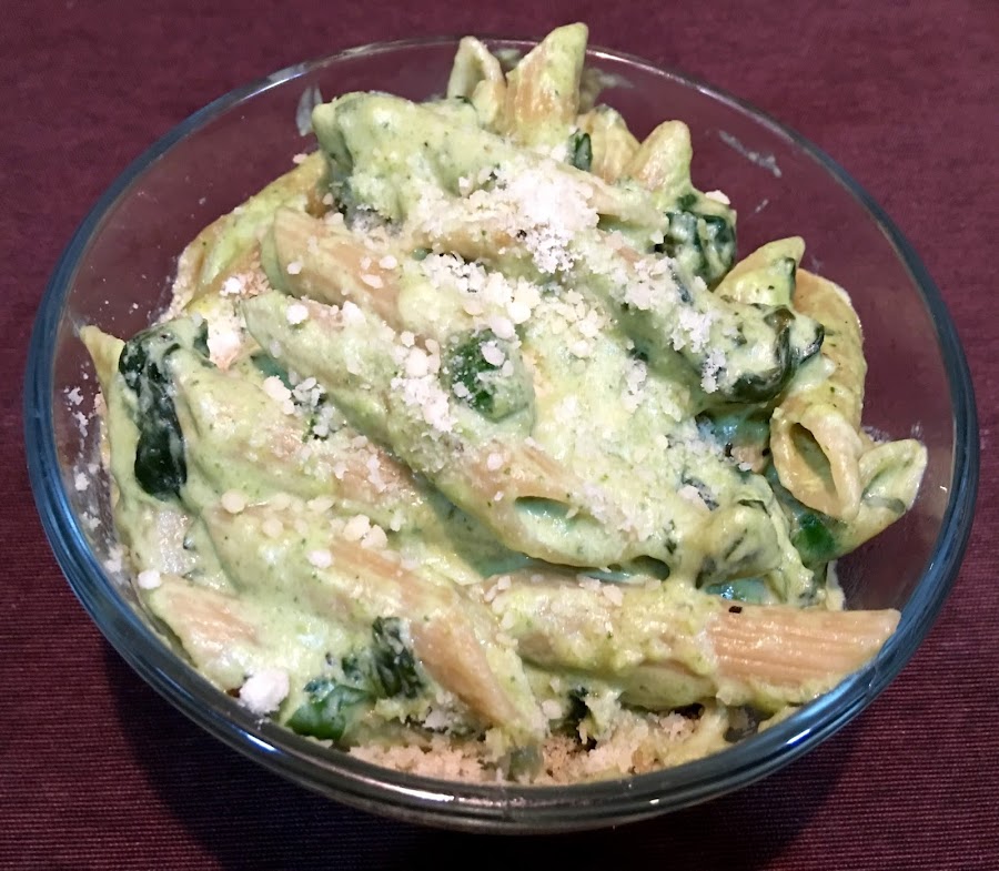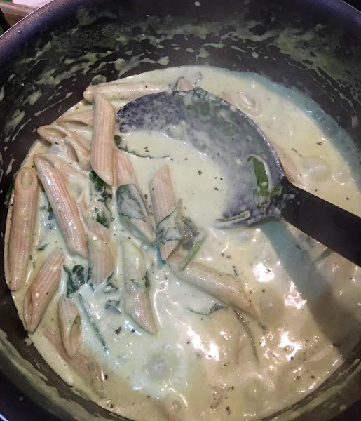 4.- Al concluir el par de minutos de licuado incorporamos esta mezcla a la sarten donde estamos cocinando la pasta, revolvemos hasta que se mezclen por completo, picamos el resto de las espinacas y las agregamos a la pasta, bajamos el fuego y dejamos que se cocine por 5 minutos.