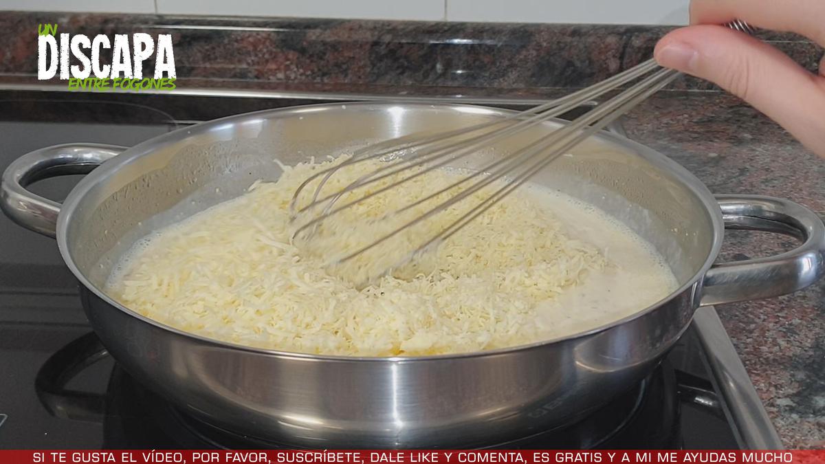2Después, en una cazuela, añadimos la leche y una cucharada de maicena y mezclamos bien. Después, añadimos una cucharadita de mostaza, una pizca de sal y pimienta al gusto y lo mezclamos todo bien. Después, añadimos la mantequilla y dejamos que se derrita y a continuación añadimos el queso cheddar y mezclamos hasta conseguir una salsa cremosa.