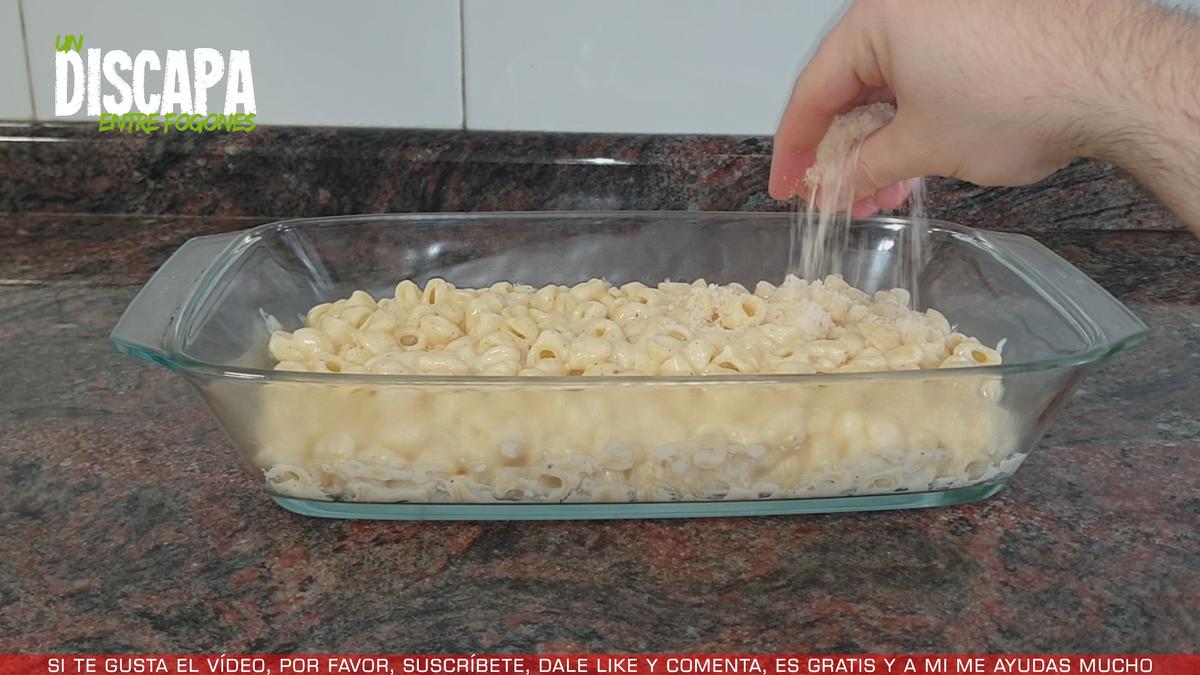 4Ahora añadimos la pasta en un recipiente apto para el horno. Añadimos el queso parmesano por encima.