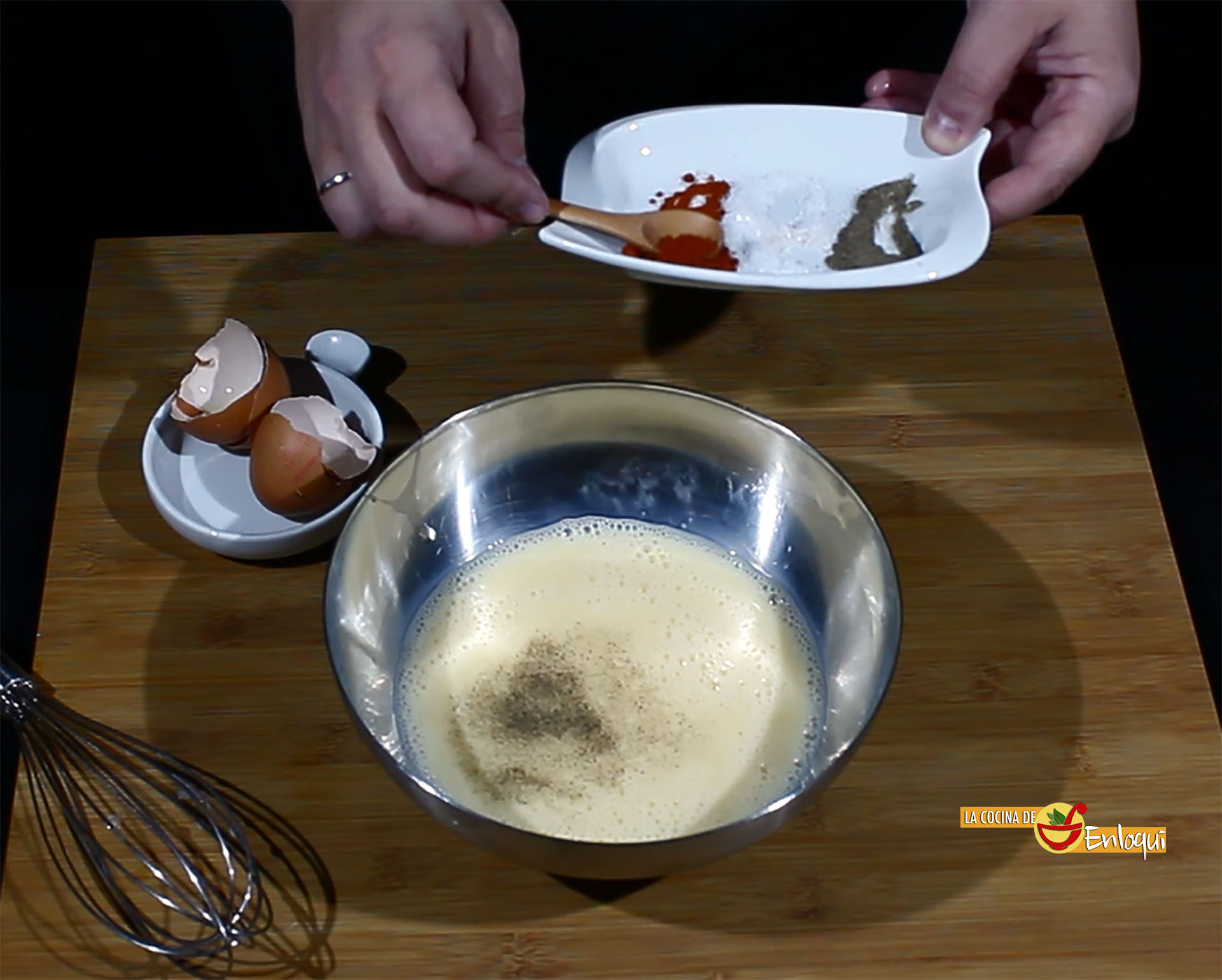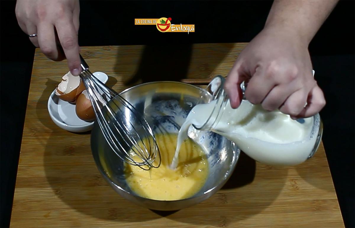 Bate en un bol los huevos y añade la leche, la sal, la pimienta y el pimentón. Mezcla todo muy bien y reserva.