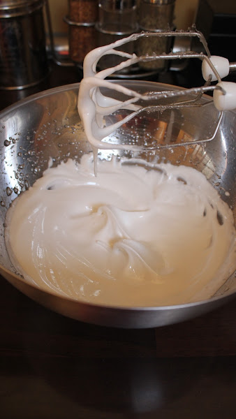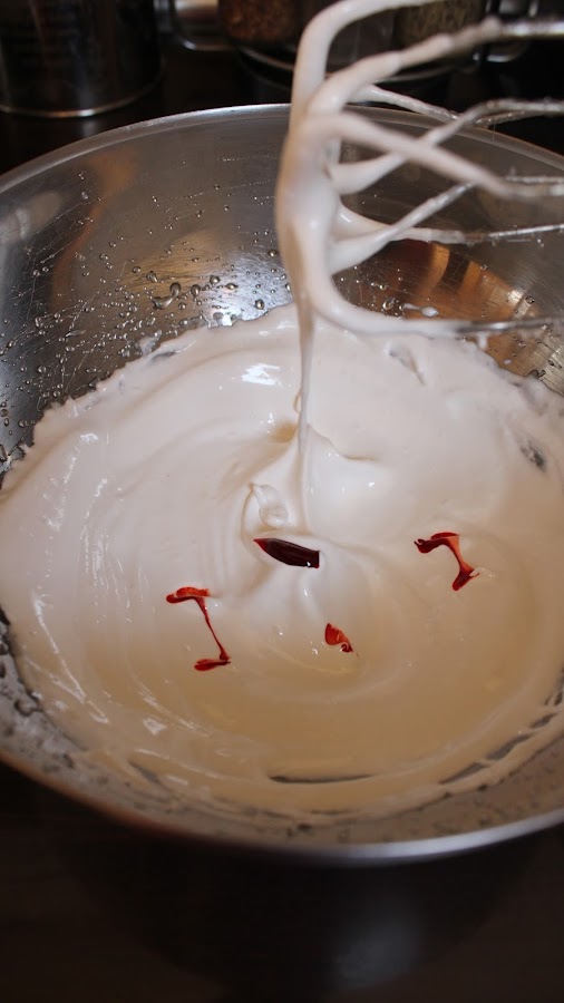 3. Cuando llegue el almíbar a la temperatura adecuada (118°C), lo echamos sobre las claras montadas en un hilo finito mientras batimos sin parar con las varillas eléctricas. Conseguiremos un merengue brillante y con picos. Seguimos batiendo hasta que se baje la temperatura del merengue.