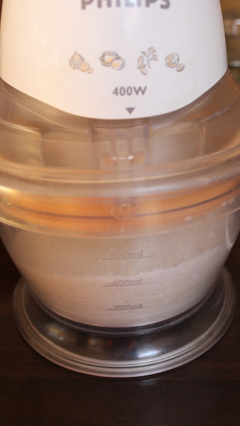 1. Primero, mezclamos las almendras molidas en polvo junto con el azúcar glass y luego pasamos esta mezcla por un robot y trituramos. Esto lo hacemos para que los polvos estén todavía más finos y no nos quede la masa granulosa.