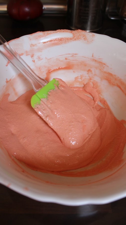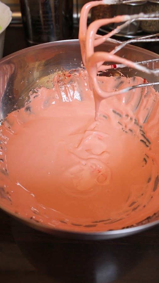 4. Ahora ya podemos agregar el colorante en gel o en polvo elegido y seguimos batiendo con las varillas eléctricas hasta que se integre el colorante por completo.