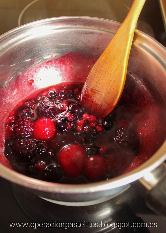 1. En un cazo, ponemos los frutos rojos congelados con un pelín de azúcar y los llevamos a fuego medio hasta que la fruta suelte todo sus jugo.