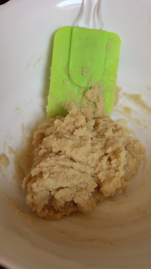 3. Agregamos los 28 g de claras de huevo envejecidas (eso quiere decir que separamos las claras de las yemas y las conservamos en la nevera tapadas durante 3 días). El día que queremos hacer nuestros macarons, sacamos las claras viejas de la nevera y las dejamos a temperatura ambiente antes de utilizarlas, y removemos con una espátula hasta conseguir una masa de este aspecto: