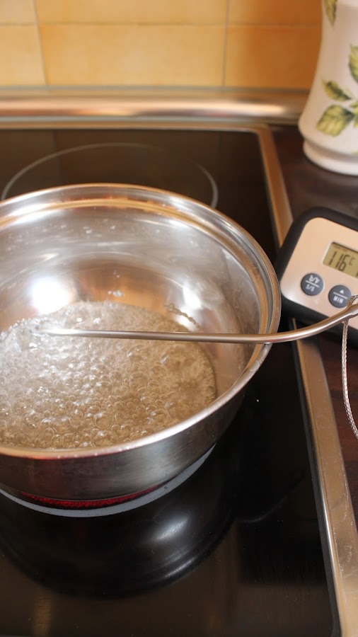 1. En un cazo, mezclamos el azúcar granulado con el agua y los llevamos al fuego moderado sin remover en ningún momento hasta conseguir un almíbar que llega a 118°C. Es muy aconsejable utilizar un termómetro para unos resultados óptimos.