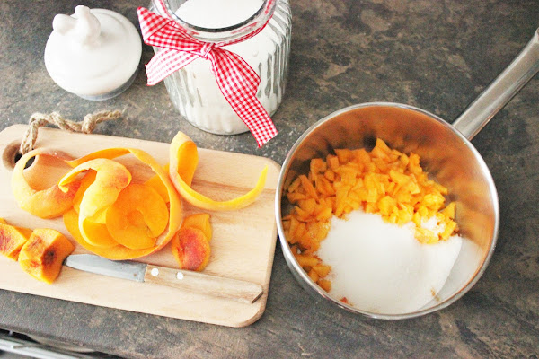 Mientras, cortar los melocotones en trozos pequeñitos y mezclar con