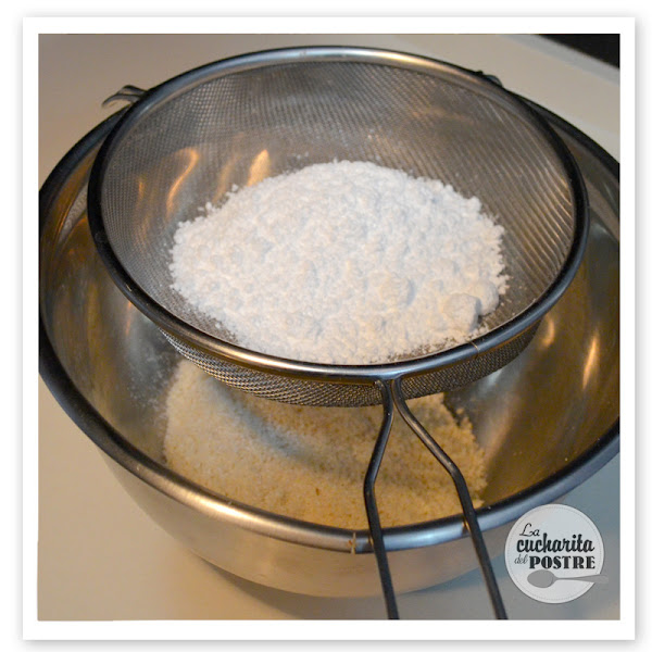 2. Una vez que tengas la harina de almendra bien fina, tamiza encima el azúcar glasé una vez.