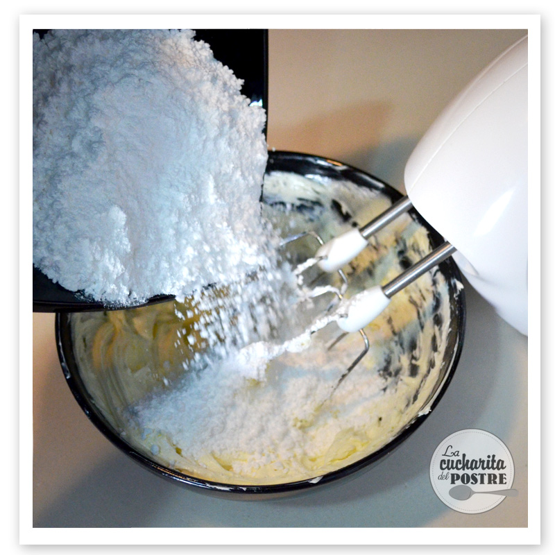 1. Bate la mantequilla a temperatura ambiente durante 5 minutos con la batidora hasta que quede cremosa y de color blanquecino. Así conseguirás que la crema no tenga sabor a mantequilla. Después, añade el azúcar glasé y bate otros 5 minutos hasta tener una crema.
