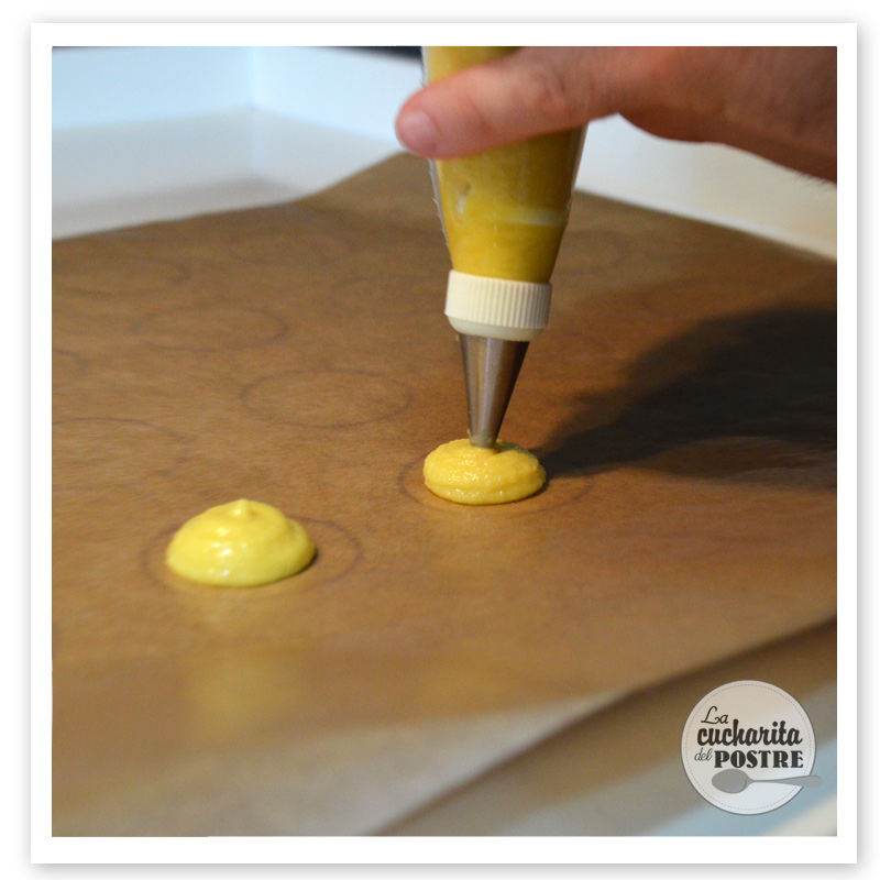 3. Usando una plantilla, pon papel de horno encima sobre una placa de horno y ve haciendo circulitos en el centro con la masa, dejando separación entre ellos porque la masa se expandirá durante el horneado.
