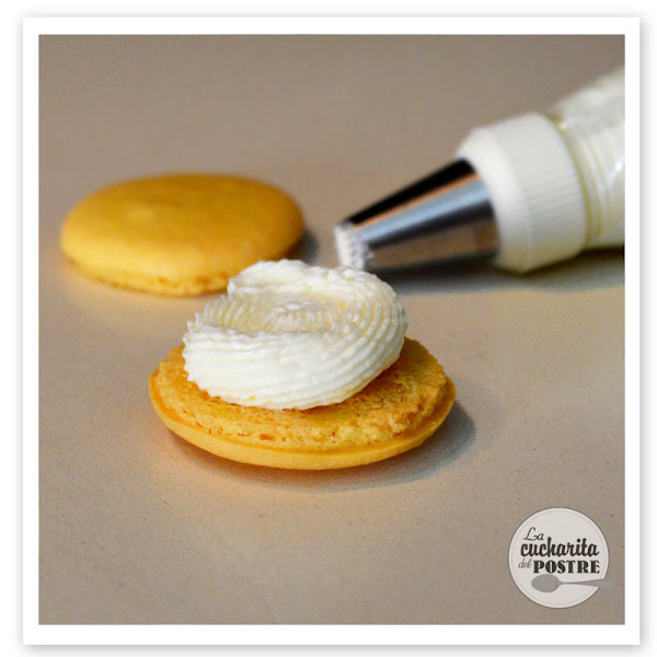 4. Para finalizar los macarons, pon la crema en una manga pastelera con una boquilla rizada pequeña y rellena una de las conchas haciendo una espiral.