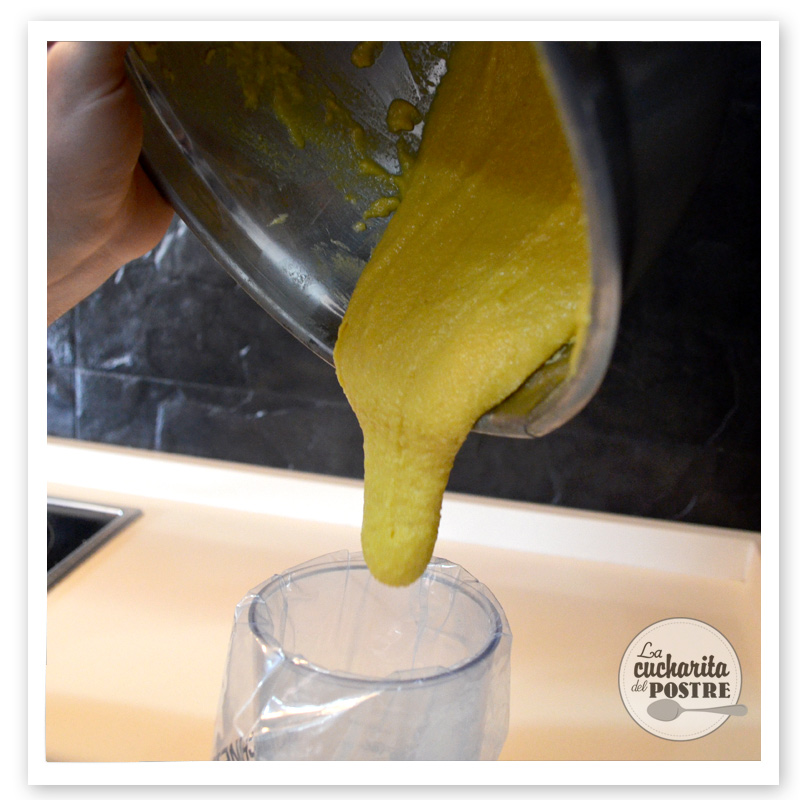 2. Debes mezclar poco a poco hasta que la masa tenga el denominado "punto de cinta"; es decir, si levantas la espátula y dejas caer la masa, ésta debe de caer en forma de cinta, de manera fluida pero sin estar líquida. Cuando la tengas, ponla en una manga pastelera con una boquilla redonda pequeña.