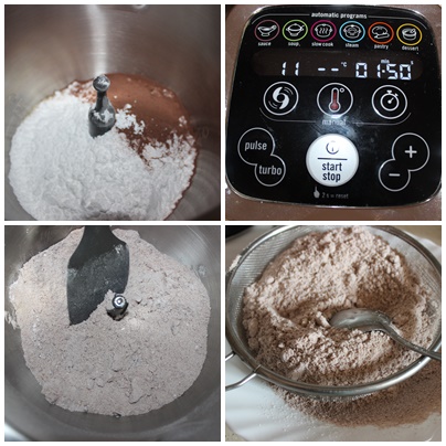Si tenemos robot de cocina trituramos todo junto, la almendra, el cacao, el azúcar glas con el robot hasta que sea polvo. Luego lo tamizamos todo para que queden mas finos