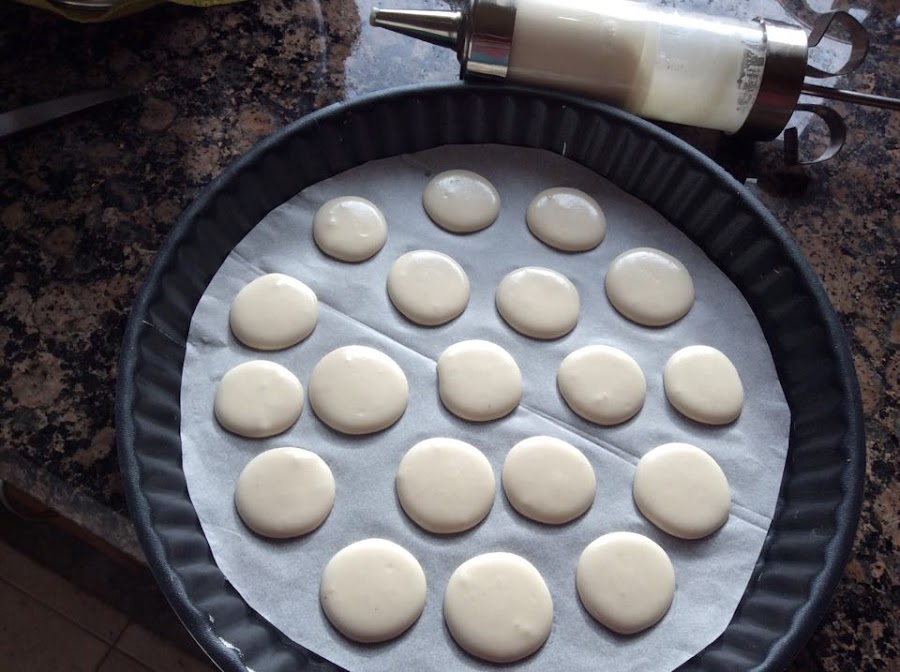 Preparar una plantilla con círculos de unos 3 cm de diámetro separados unos de otros unos dos centímetros. Yo los he dibujado con lápiz el papel de horno y lo he puesto con la parte escrita hacia abajo. Colocar la plantilla en la bandeja.