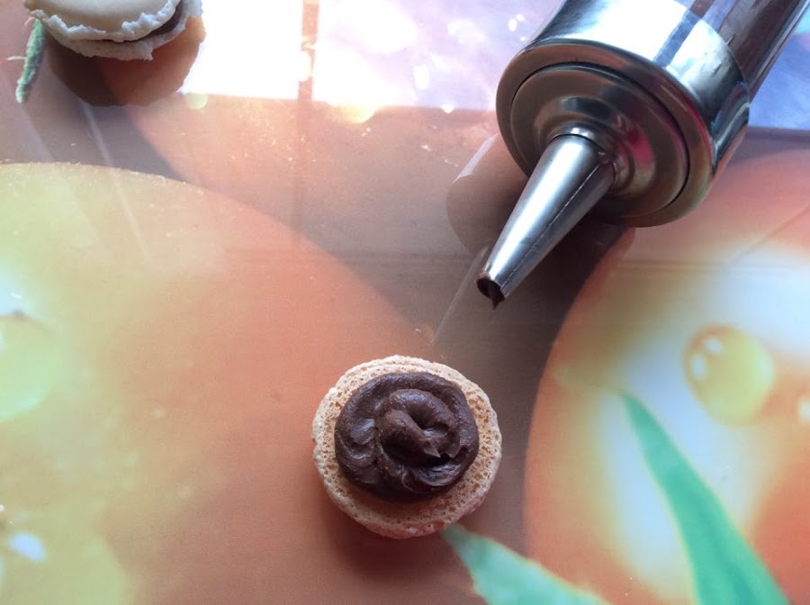 Para rellenarlos colocar el garnache de chocolate en una manga pastelera y en una de las tapas hacer círculos concéntricos sin acercarnos mucho a los bordes.