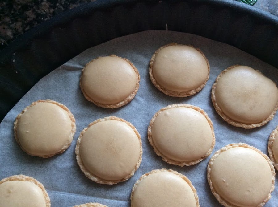 Cuando estén ya secos por arriba, precalentar el horno a 140º y, cuando esté caliente, cocinar los macarons en la bandeja del medio durante 15 minutos.