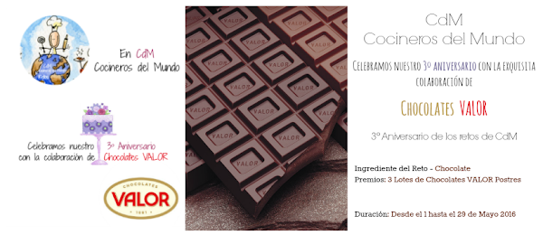Con esta receta participo en el 3º Aniversario de los retos de CdM - Cocineros del Mundo en colaboración con Chocolates Valor.