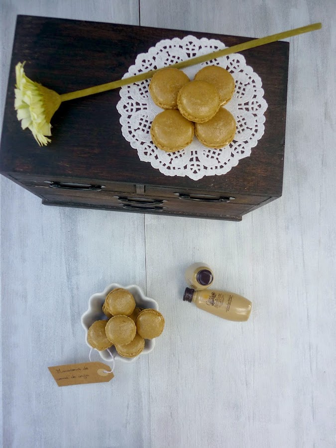 La receta de los macarons la podéis ver aquí, en esta ocasión le puse un poco de colorante marrón a la masa. El relleno lo tenéis en la entrada de los cupcakes.