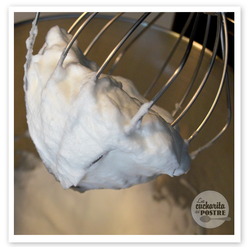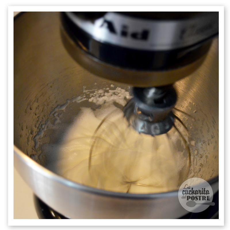 3. Sigue batiendo las claras un poco más mientras viertes en forma de hilo el almíbar, despacio y con cuidado de que éste no toque las varillas ni las paredes del bol directamente. Por el cambio de temperatura se endurece un poco. Si cae un poquito no pasa nada, es normal.