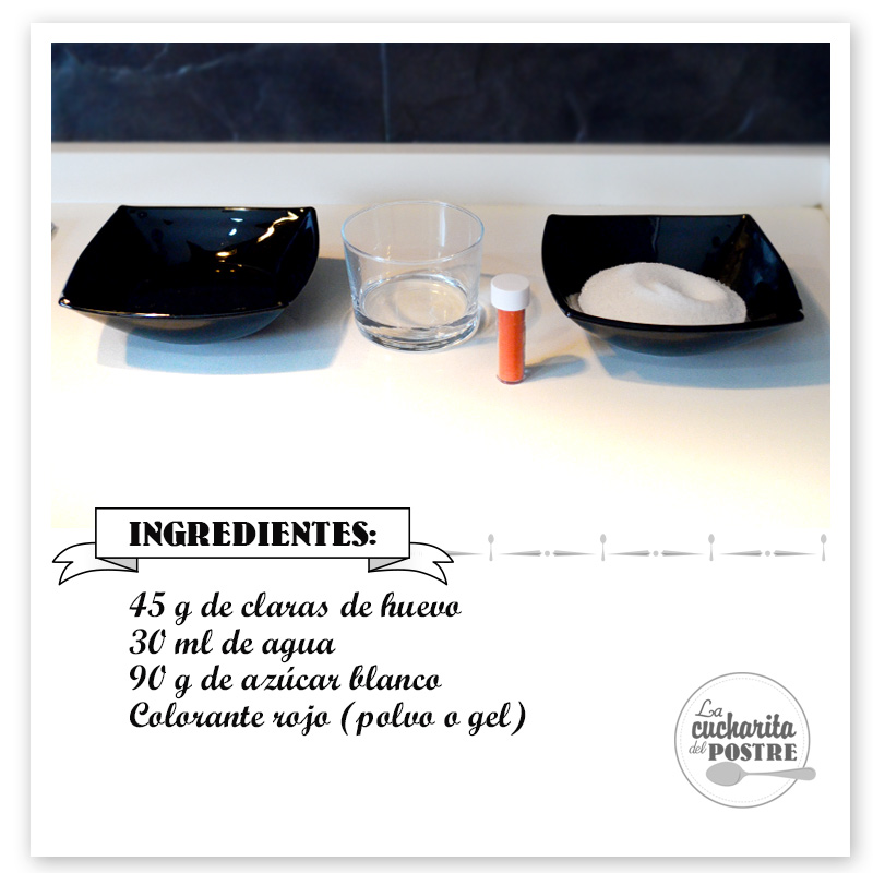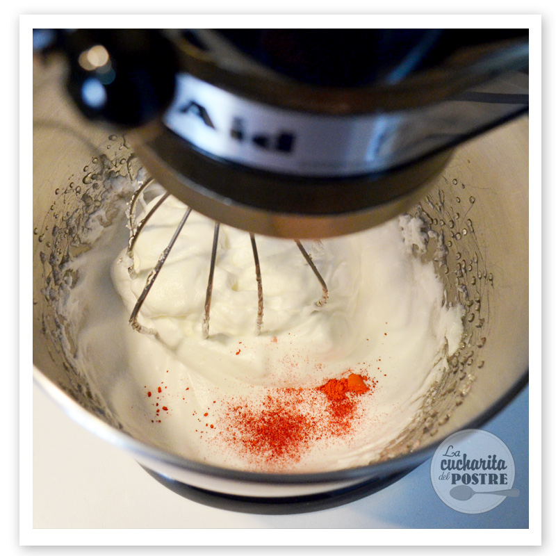 4. Una vez que el merengue está brillante y hace picos duros, añade el colorante a tu gusto. Yo he usado colorante en polvo rojo de la marca Sugarflair. También se puede usar en gel o en pasta, pero hay que evitar los que son líquidos porque cambian la textura del merengue y lo dejan más acuoso.