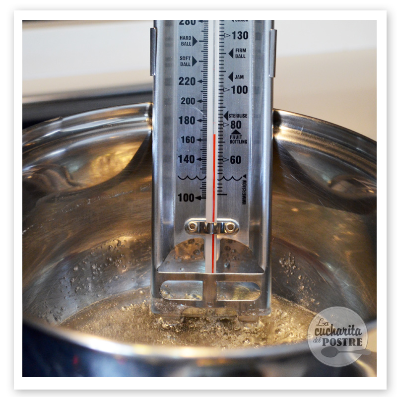 2. Para que sea un merengue italiano, debes preparar un almíbar poniendo a hervir el azúcar con el agua. Utiliza un termómetro de azúcar y retira el almíbar del fuego cuando alcance los 115ºC. Vamos, ni se te ocurra de ninguna de las maneras tocar eso porque te achicharrás vivo.