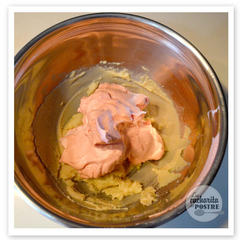 5. Mezcla el merengue con el mazapán con movimientos envolventes, poco a poco, sin demasiada brusquedad. Con paciencia conseguirás que se vayan integrando por completo.